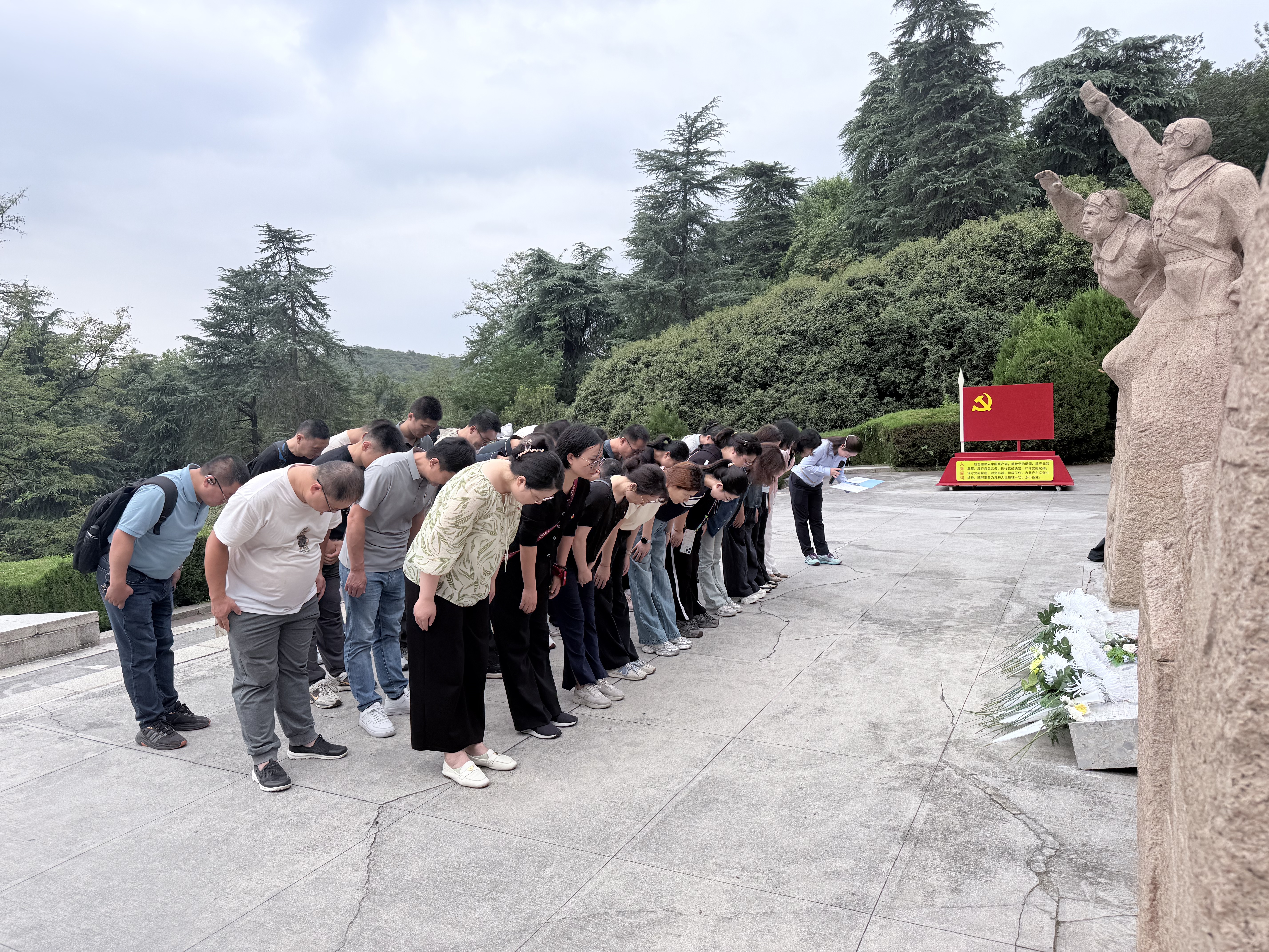 庄重的凭吊仪式在抗日航空纪念碑前举行,全体党员肃立高唱国歌,激昂旋律涤荡心灵。党员代表敬献花篮、整理挽联,表达对先烈无限的哀思与崇高的敬意。全体人员向长眠于此的英烈们行鞠躬礼并绕纪念碑广场一周进行瞻仰,缅怀为抗战胜利献出生命的革命烈士和民族英雄。